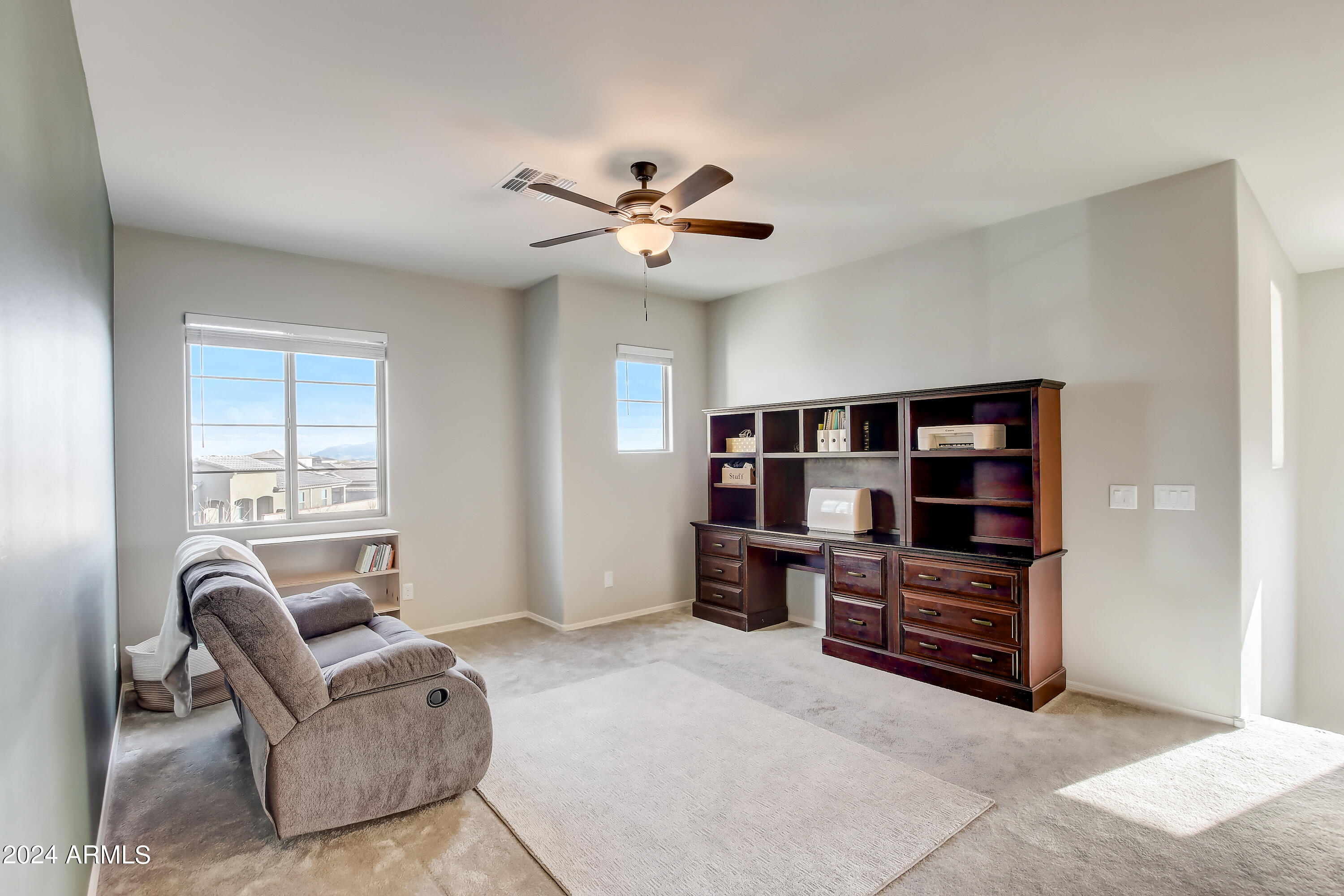 Embrace the beauty of this stunning home, offering panoramic views of the majestic White Tanks Mountains. Experience the expansive outdoor oasis, boasting one of the most spacious backyards within the neighborhood, and relax on the extended patio surrounded by lush garden views. Inside, discover soaring ceilings, a tranquil color scheme, and ample natural light. The kitchen boasts granite countertops, modern appliances, and a central island with a breakfast bar. Upstairs, a versatile loft and well-appointed bedrooms await. Recently updated with fresh paint throughout and new enjoyable additions to the backyard, this property epitomizes modern luxury amidst breathtaking natural surroundings.